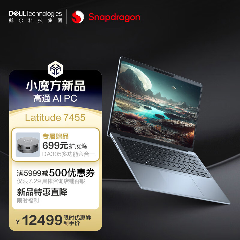 IT之家 7 月 29 日消息,戴尔新款 Latitude 7455 骁龙版现已上架京东,搭载高通骁龙 X Elite 处理器,配备?32G + 1T 存储,采用 14 英寸 2. 5K 触摸屏,首发价 12499 元。 零售版本似乎不支持定制,仅有 12 核 3.4GHz(双核 4.0GHz)的骁龙 X Elite 处理器可选,板载 32GB LPDDR5x(8448MT/s)内存,支持 300 款以上国内外应用、近 200 国内本地应用,而 Top 50 Arm 原生国内本地应用均提供支持。 这款机型还采用了 14 英寸 400 nits 亮度的 QHD+(2560*1600) IPS 屏幕,支持 AG 触控、ComfortView+、SLP,经过?TüV 护眼认证,配备 FHD 红外摄像头。 其他方面,该机还配备了 79 背光键盘(带 Copilot 键)、高通?FastConnect 7800 网卡(2x2, BT 5.4 无线)、FHD / 红外摄像头、3 芯 54Whr 电池(IT之家注:QHD 视频播放续航 22 小时)、65W 充电器(USB-C)、独立 TPM,重 1.44 千克,厚 16.90 毫米。 接口方面,该机提供了?USB-A 3.2 Gen1、双 USB 4、3.5mm 耳机孔以及 MicroSD 读卡器。 |