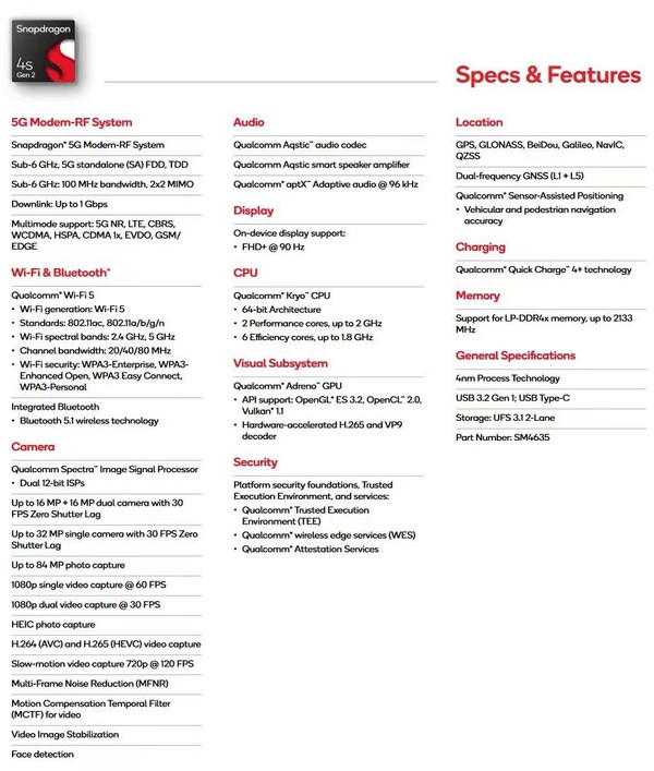 高通骁龙4s Gen 2正式发布 三星4nm工艺 主频2.0GHz 【CNMO科技消息】7月29日,CNMO注意到,高通公司正式发布旗下新款移动平台——高通骁龙4s Gen 2。 据悉,高通骁龙4s Gen 2移动平台代号SM4635,采用三星4nm工艺打造,CPU为八核心设计,包括2个高性能内核,最高可达2GHz,6个高效能内核,最高达1.8GHz,支持Wi-Fi 5、蓝牙5.1、?5G NR,最高支持8400万像素照片拍摄,支持录制1080P 60P视频,支持FHD+ 90Hz屏幕,支持最高2133MHz的LPDDR4X运行内存。 和高通骁龙4 Gen 2移动平台相比,高通骁龙4s Gen 2移动平台的多项能力均有下调。例如,CPU大核主频从2.3GHz下调为2.0GHz,内存不再支持LPDDR5,不再支持一亿像素。 综合来看,高通骁龙4s Gen 2移动平台属于入门级产品,未来应该会出现在百元价位段的机型上,暂不清楚哪款机型将首发高通骁龙4s Gen 2,对此感兴趣的网友可以关注一下各家厂商的官方消息。 值得一提的是,高通将于今年10月21日在夏威夷发布骁龙8 Gen 4移动平台,小米15系列将在10月底全球首发骁龙8 Gen 4。 版权所有,未经许可不得转载 (本文来自于手机中国) |