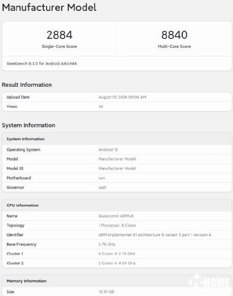 骁龙8 Gen4的跑分成绩已经出现在了Geekbench上,单核得分为2884分,多核成绩为8840分,比起骁龙8 Gen3有着较为明显的升级。 代号为Manufacturer Model的骁龙8 Gen4,即将在10月21日举办的骁龙技术峰会中公布,这颗芯片将采用台积电3nm工艺制造,由于采用了自研CPU架构,性能方面是非常值得期待的。 目前,骁龙8?Gen4的跑分成绩已经出现在了Geekbench上,单核得分为2884分,多核成绩为8840分,比起骁龙8?Gen3有着较为明显的升级。 骁龙8?Gen4的跑分成绩与苹果A17 Pro的表现差不多,不过骁龙8?Gen4的测试机型大概率就是个参考设计,还有很大的优化空间,在最终的量产手机中,可能会有更强的实际表现。 新款的苹果iPhone 16 Pro系列手机,预计将采用苹果A18系列芯片。此前有消息称,A18处理器只会比当前iPhone 15 Pro Max中的A17 Pro快一点。 在多核测试中是骁龙8 Gen4的优势,8840分的成绩比起A系列处理器的表现要更好。 据悉,骁龙8 Gen4将配备新的自定义内核架构,使用Oryon CPU八核架构,具体核心分布可能是2+6,大核的性能表现很强,主频可能超过4GHz,因此单核性能很强。 |