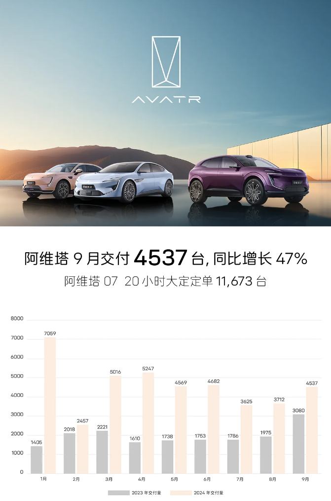 感谢IT之家网友 超直、張大胆 的线索投递! IT之家 10 月 1 日消息,阿维塔今日宣布 9 月交付新车 4537 台,同比增长 47%,阿维塔 07 车型 20 小时大定定单 11,673 台。 IT之家注意到,阿维塔 07 车型于 9 月 26 日刚刚迎来上市,共推出 6 款车型,增程版售价区间为 21.99-27.99 万元,纯电版车型售价区间为 22.99-28.99 万元。 该车最高提供 27 颗高感知传感器(IT之家注:含 192 线激光雷达),首批搭载华为乾崑智驾 ADS 3.0。该车配备鸿蒙?Harmony OS 4.0 座舱系统,支持四屏联动、无缝流转等。 此外,阿维塔 11/12 车型则在 9 月获推 AVATR.OS 4.0.0 升级,支持华为乾坤智驾 ADS 3.0,新增城区智驾领航辅助路边启动功能、泊车辅助机械车位泊车功能(且支持遥控泊车)等。 IT之家汇总已公布的 2024 年 9 月汽车销售 / 交付数据如下: 理想汽车:9 月交付新车 53,709 辆,同比增长 48.9% 零跑汽车:9 月交付新车 33,767 辆,同比增长 113.7% 深蓝汽车:9 月交付新车 22,709 辆,同比增长 30.74% 小鹏汽车:9 月交付新车 21,352 辆,同比增长 39% 极氪汽车:9 月交付新车 21,333 辆,同比增长 77% 北汽新能源:9 月销售新车 15,781 辆 长安启源:9月交付新车 11,615 辆 岚图汽车:9 月交付新车 10,001 辆,同比增长?99.62% 阿维塔汽车: 9 月交付新车 4537 辆,同比增长 47% 智己汽车:9 月销售新车 4516 辆,同比上涨 150% 极越汽车:9 月交付新车 2605 辆,环比增长 23% 广告声明:文内含有的对外跳转链接(包括不限于超链接、二维码、口令等形式),用于传递更多信息,节省甄选时间,结果仅供参考,IT之家所有文章均包含本声明。 |