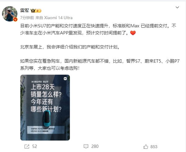 格局!雷军推荐友商车型:智界S7、蔚来ET5等都不错 【CNMO科技消息】4月22日,CNMO注意到,雷军发文称,“目前小米SU7的产能和交付速度正在快速提升,标准版和Max 已经提前交付。不少准车主在小米汽车APP里发现,预计交付时间提前了。北京车展上,我会详细介绍我们的产能和交付计划。如果您实在着急购车,国内新能源汽车都不错,比如,智界S7、蔚来ET5、小鹏P7系列等,大家也可以考虑选购!” 目前,小米汽车已宣布将于4月25日上午09:20召开北京车展发布会。届时,雷军将亲临现场与车迷们进行互动交流,并公布小米SU7上市28天以来的锁单交付成绩。此外,他还将透露一些关于小米SU7在2024年的新计划。 据了解,小米汽车的展位位于此次北京车展的W2馆W203展位。从之前小米汽车的热度来看,W2号馆无疑将成为此次车展上人流量最大、最受关注的展区之一。有意思的是,根据北京车展官方公布的展位分布图,小米、极越、智己、吉利都聚集在同一个展馆(W2馆)。 此外,根据知名博主“孙少军”上周透露的数据,小米SU7的锁单量已经突破6万大关,显示出市场对这款车型的热烈追捧。虽然大定退单率约为55%,但这并不影响小米SU7作为一款备受关注的新能源汽车的地位。 版权所有,未经许可不得转载 (本文来自于手机中国) |